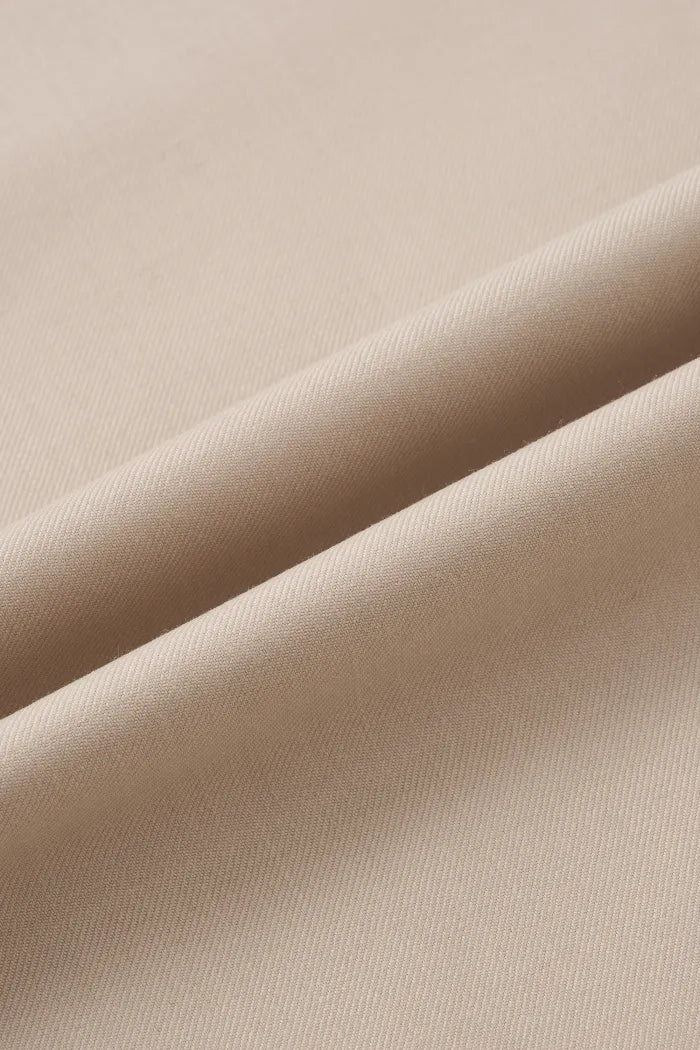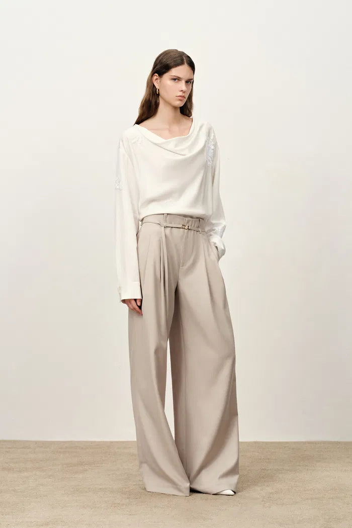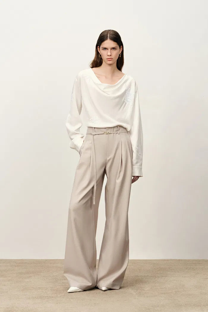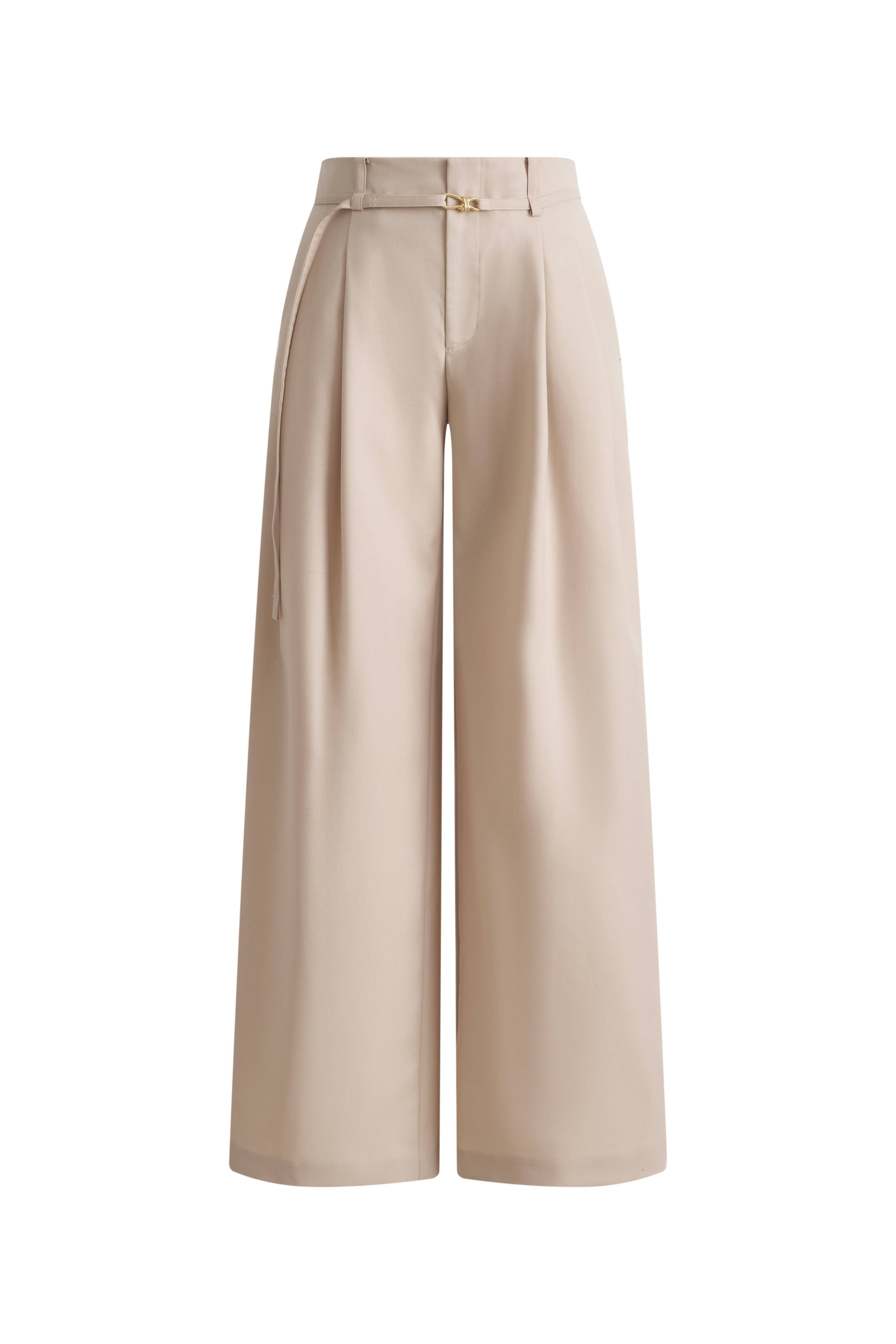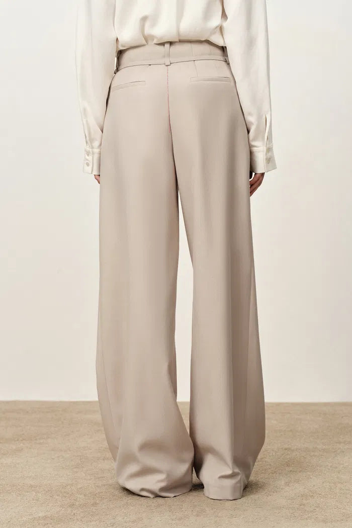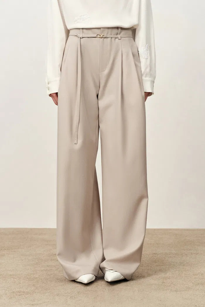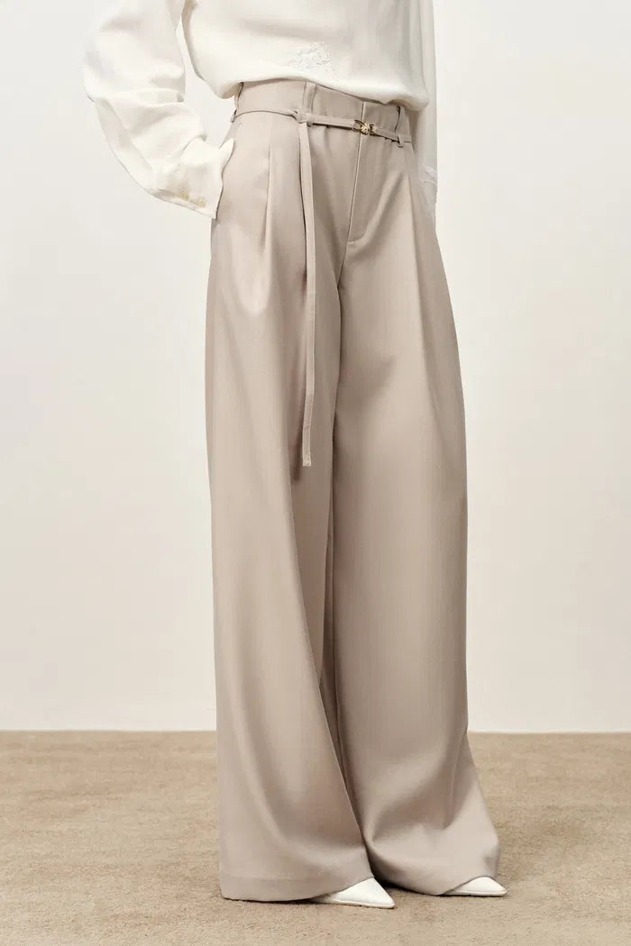 The waistband is cut as one smooth line, so these wide-leg trousers sit flat through your waist and hips. A thin belt adds shape, and the beige keeps everything quiet and easy to wear on repeat.