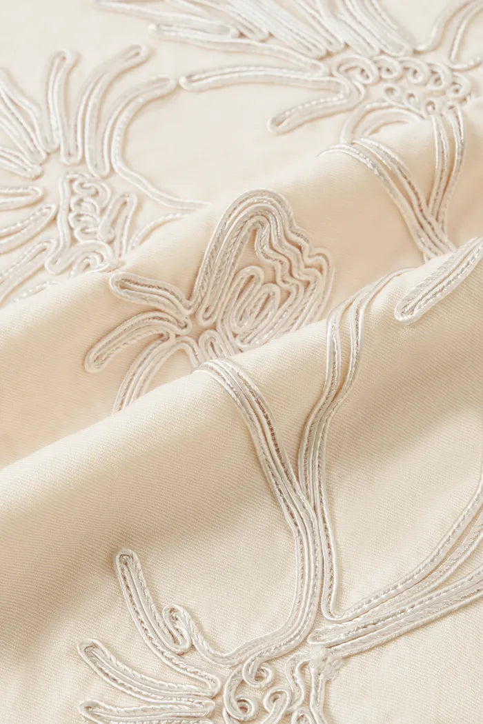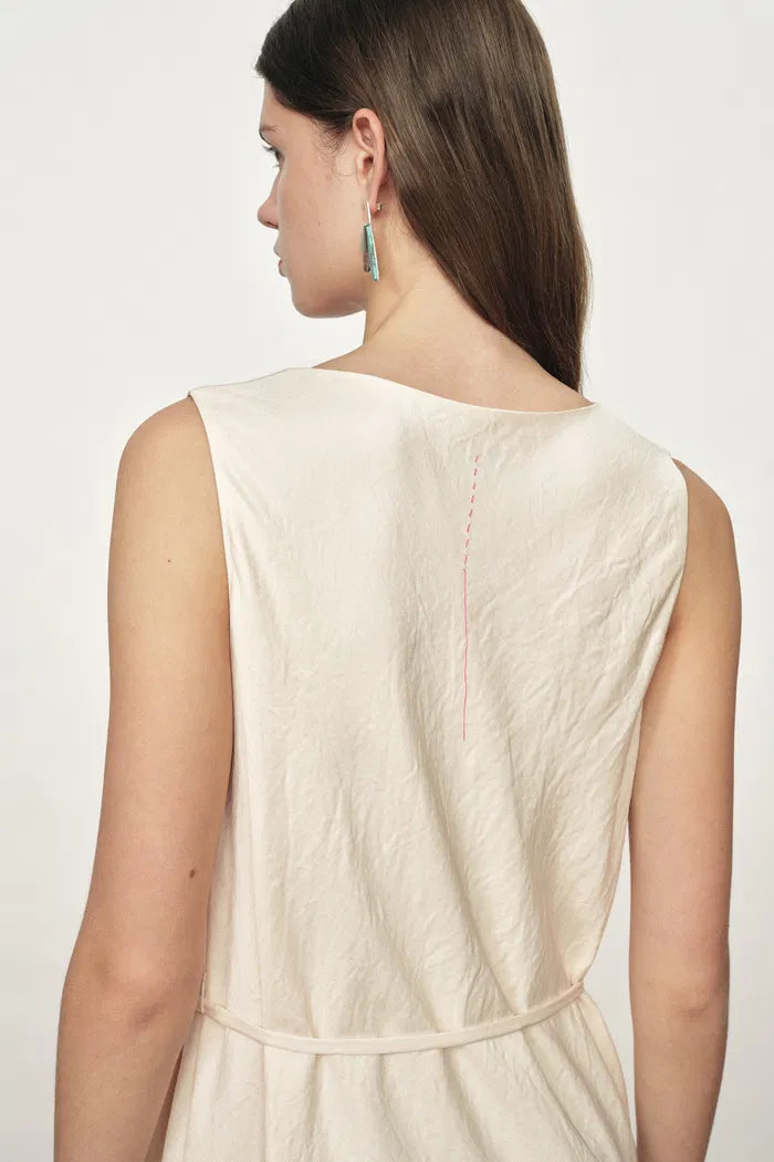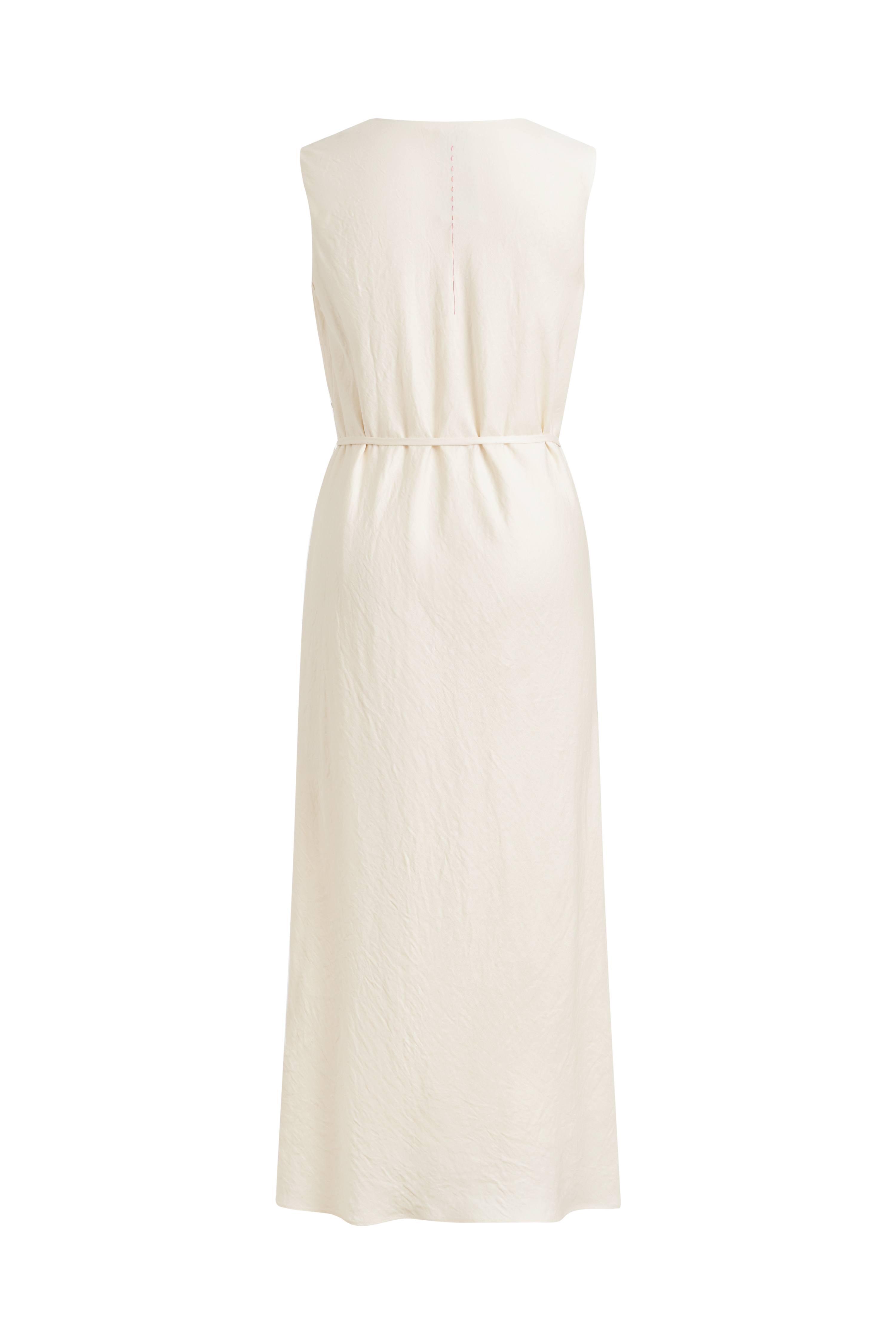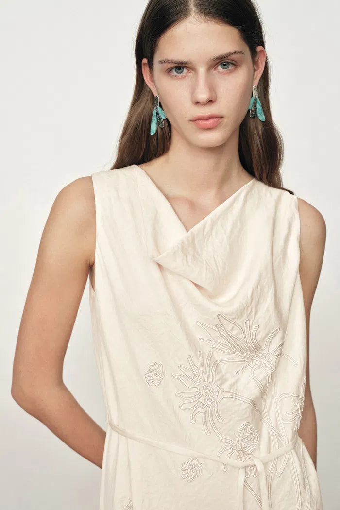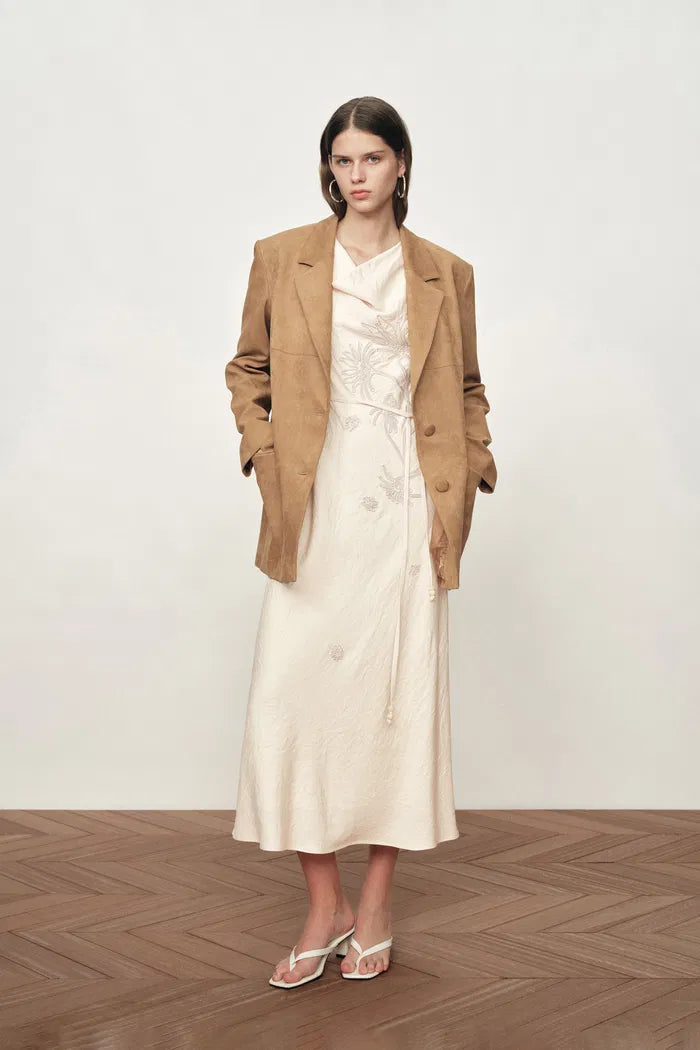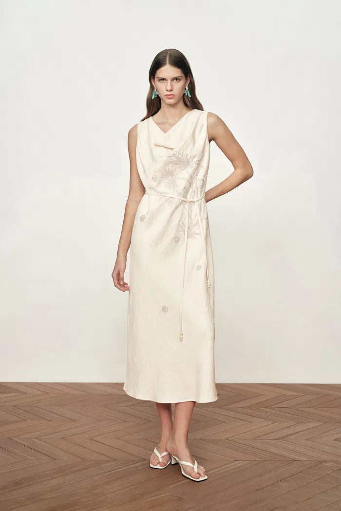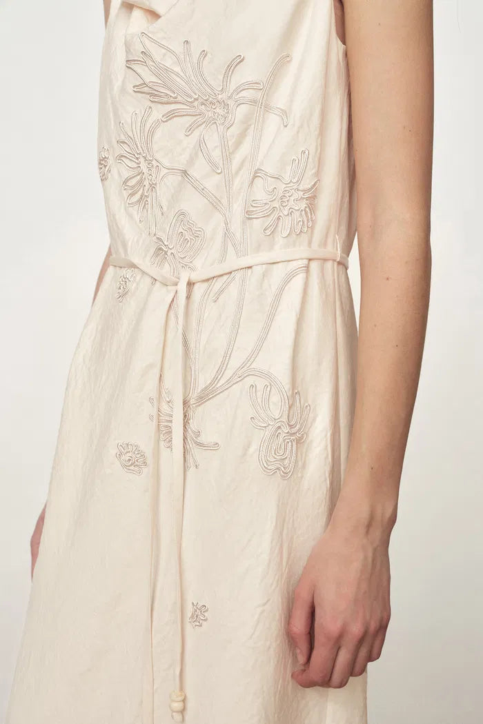 A slip dress that leans classic at first glance, then reveals detail up close. The raised embroidery adds texture where jewelry usually would, while the belt gives you the choice between clean and defined.