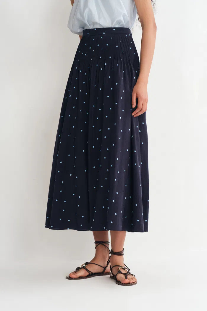 This Nora skirt pairs dense tuck pleats with a full, swinging hemline. Navy background with light blue polka dots creates vintage charm with modern proportion. The linen blend holds its shape while remaining breathable—your new favorite for both casual and dressed-up occasions.