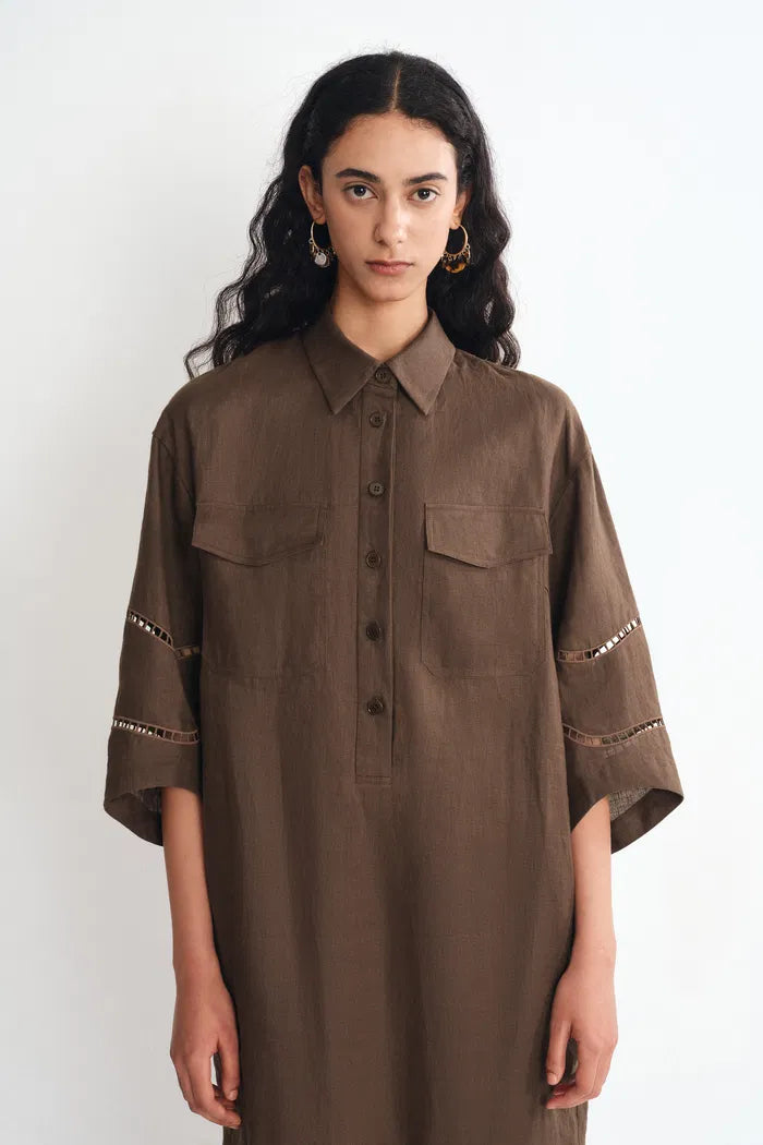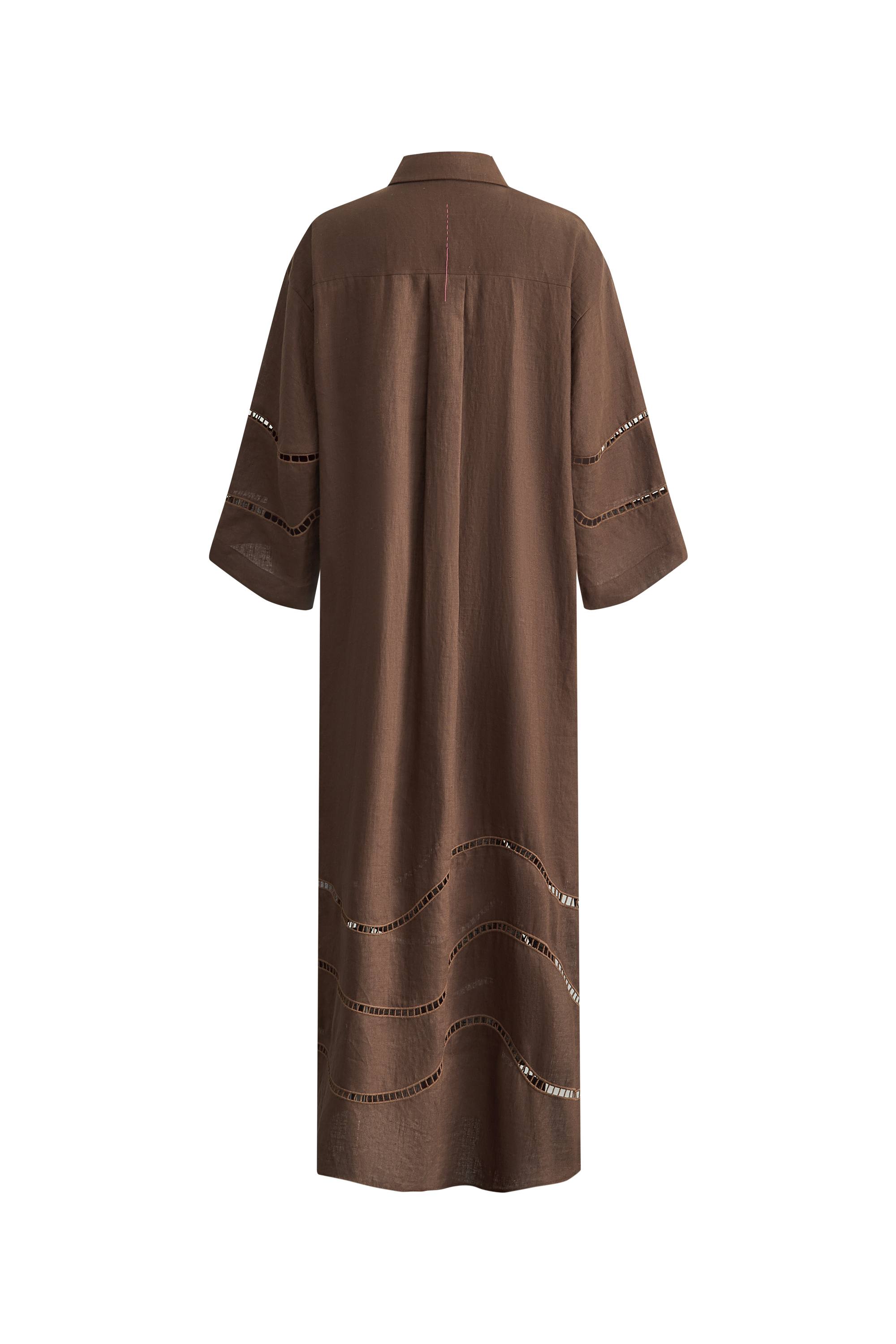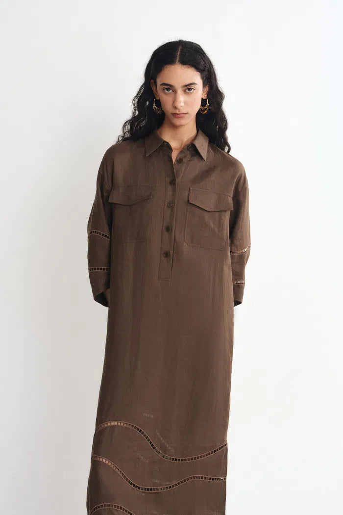 This Riley dress brings wave-inspired embroidery to relaxed linen styling. Curved sleeves echo ocean movement, while side slits ensure easy walking. In rich mocha brown that pairs beautifully with everything from sandals to statement jewelry.