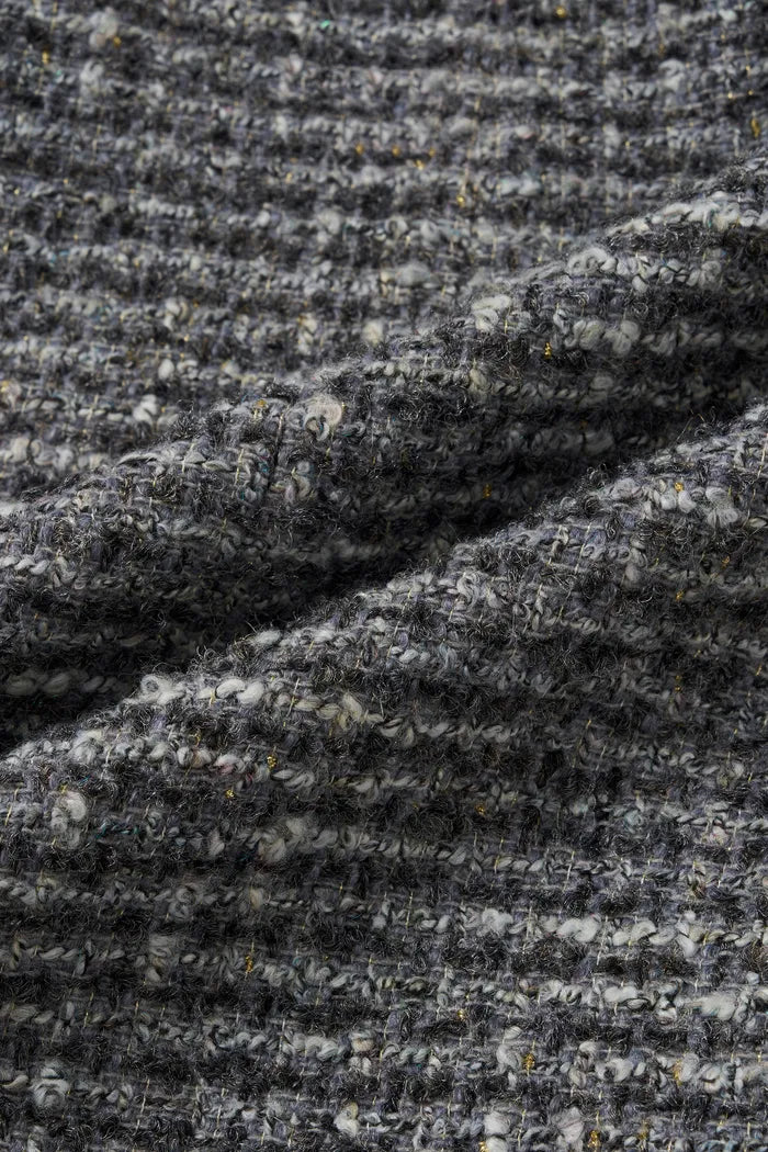 Multi-yarn bouclé with layered texture and metallic threads that catch light like afternoon sun on water. Cool silver-gray tones bring understated elegance.
