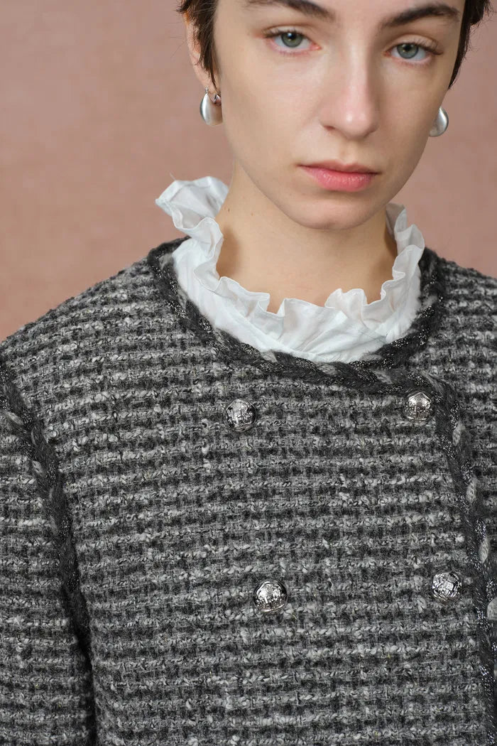 Silver crest buttons elevate the tweed with a classic Parisian touch.