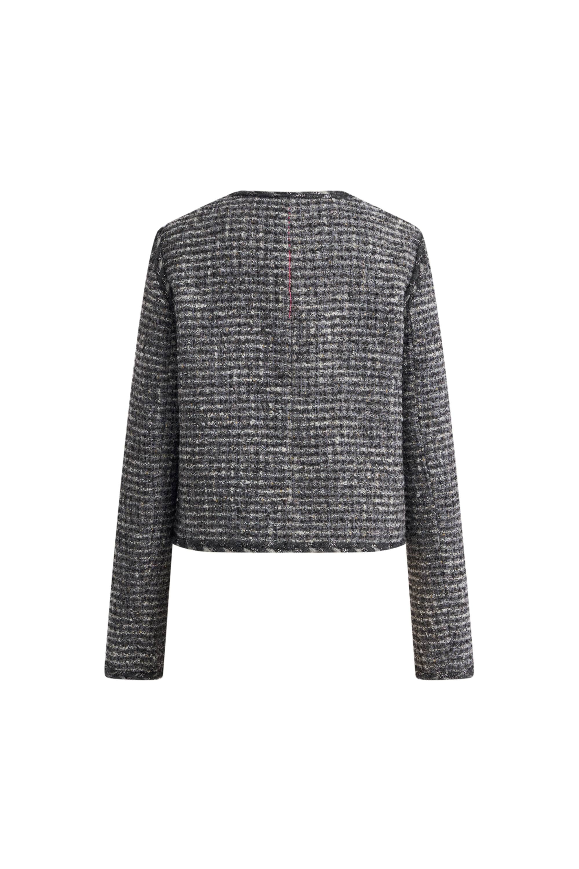 A tweed jacket with subtle metallic trims that offer just enough edge. The structured shoulders and soft grey palette make it a strong weekday staple that layers easily over simple basics.