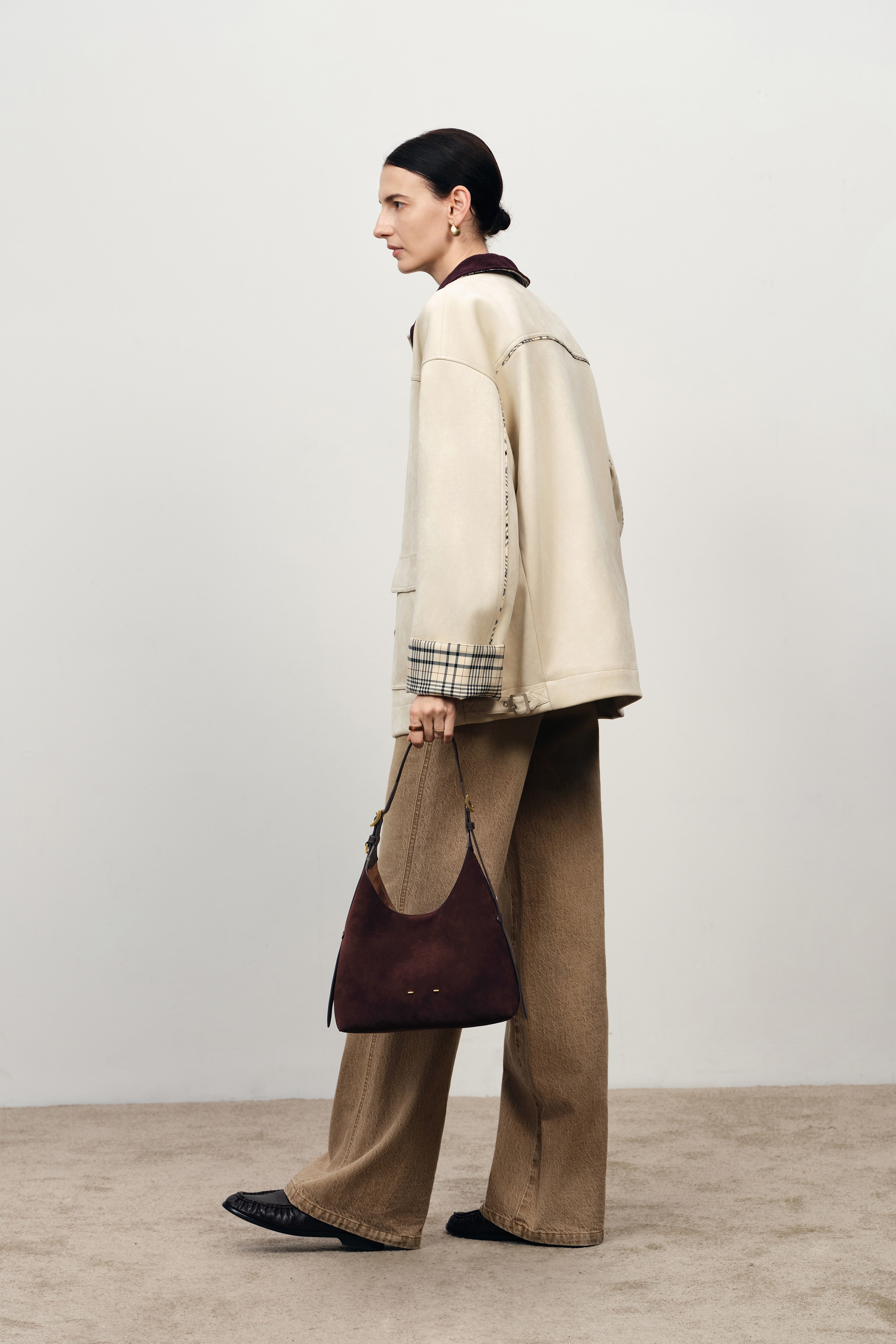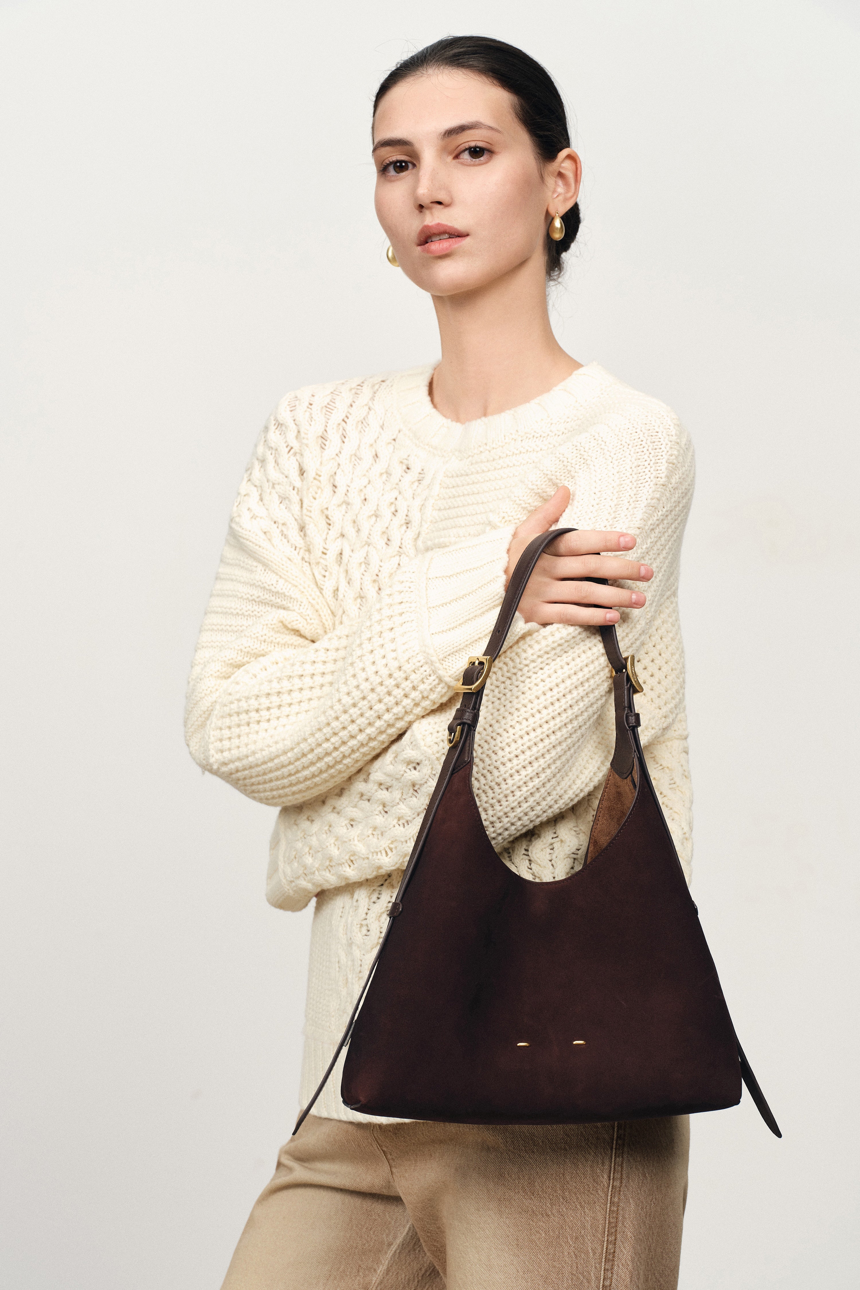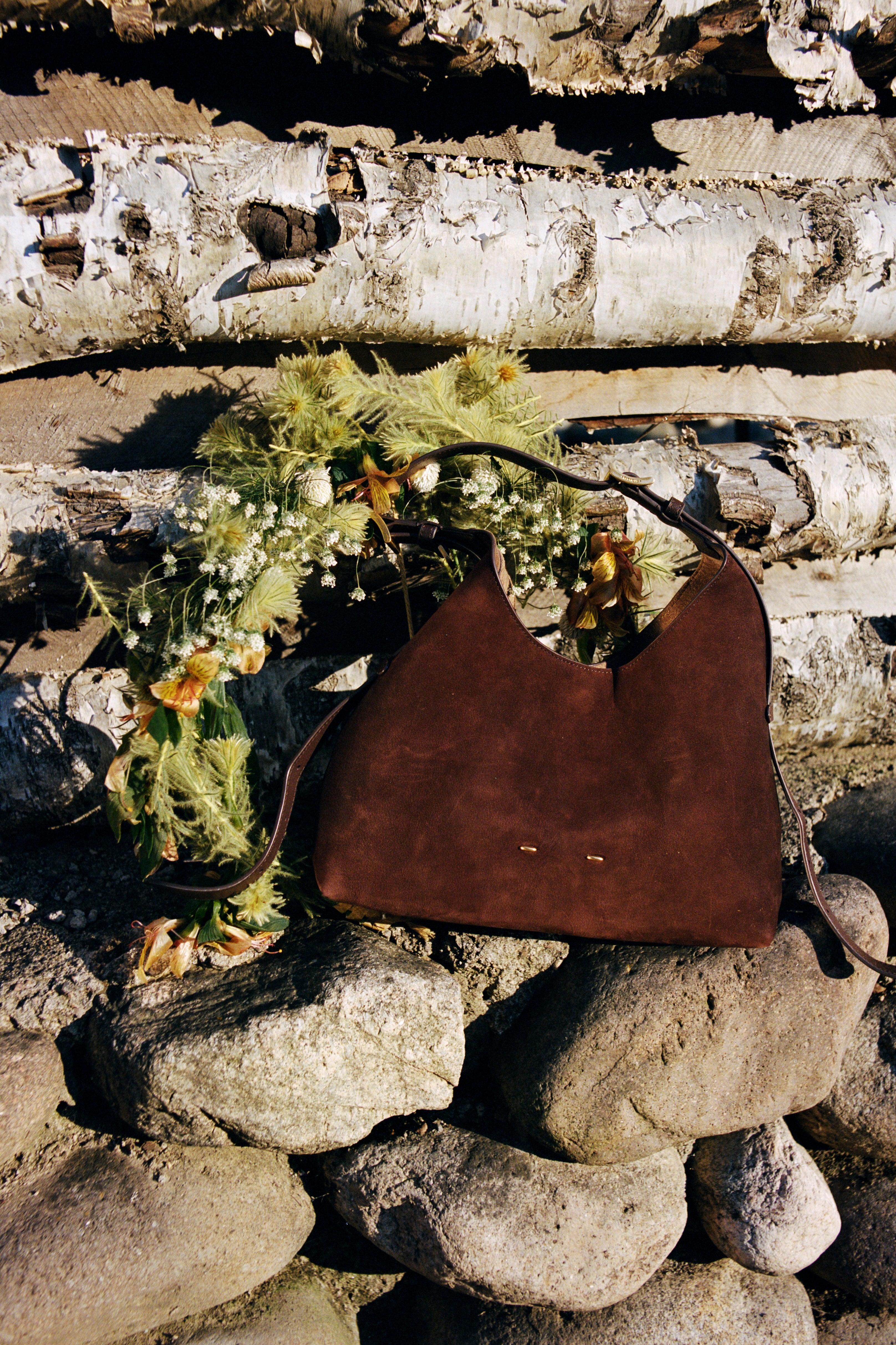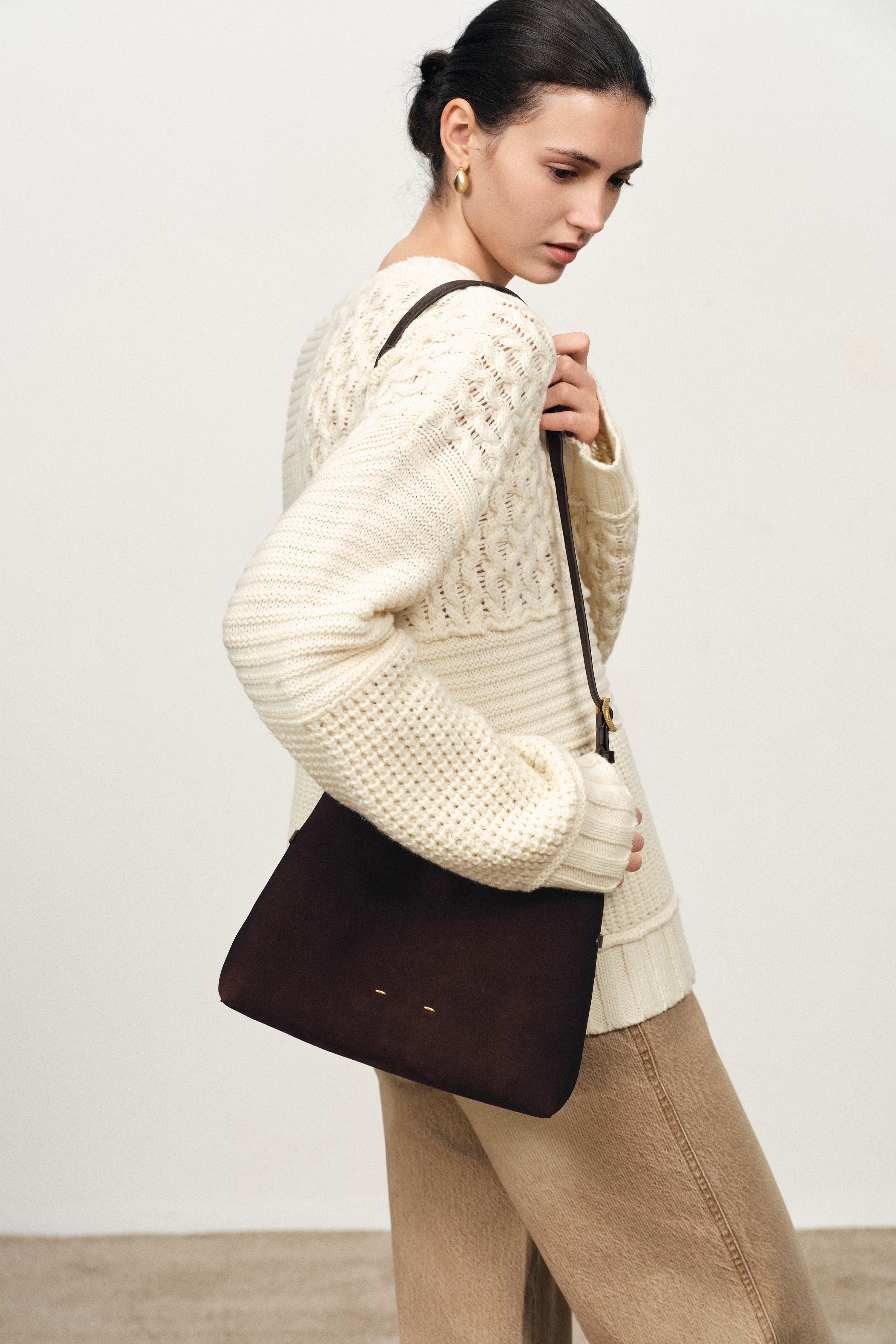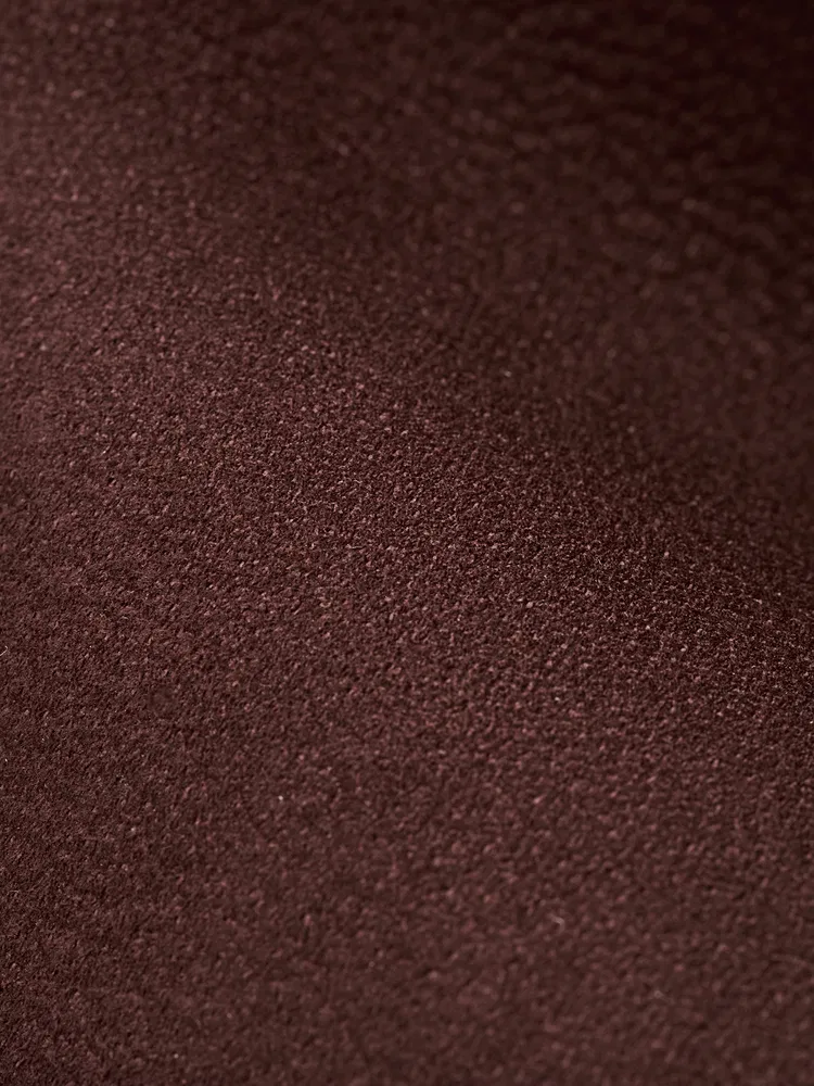 " Crafted from top-grain leather and finished with ultra-fine sanding on the grain side for a velvety, matte touch. Unlike traditional reverse suede, this nubuck has a tighter, more delicate nap that feels soft, smooth, and warm against the skin. The deep brown hue reads rich and saturated. Paired with a Nappa leather shoulder strap for a soft-yet-resilient carry. Natural growth marks and pores are intentionally preserved to maintain breathability, so every bag shows its own subtle grain. Over time, small variations may appear and smooth out easily, building a quiet patina that adds character."
