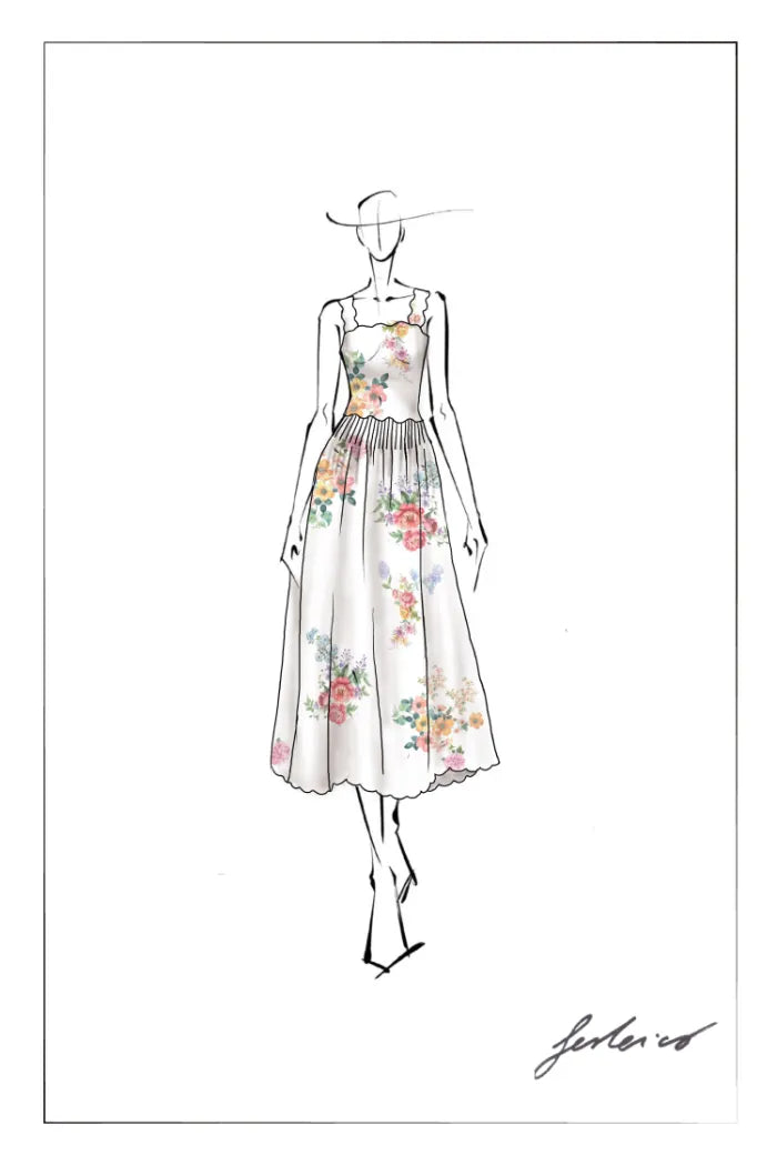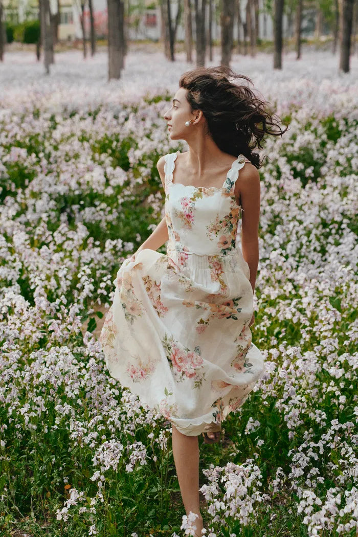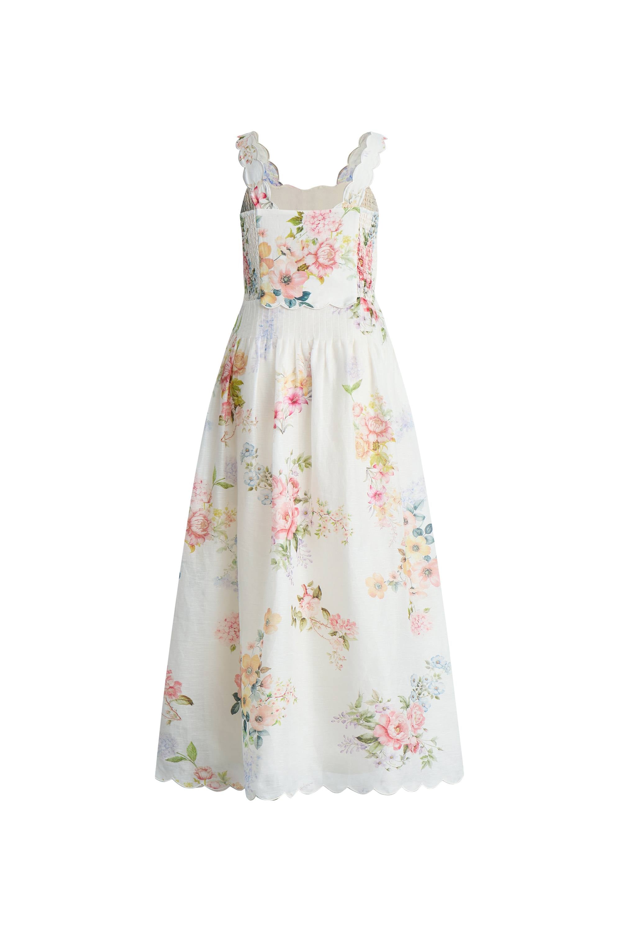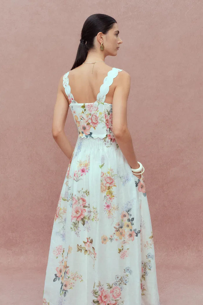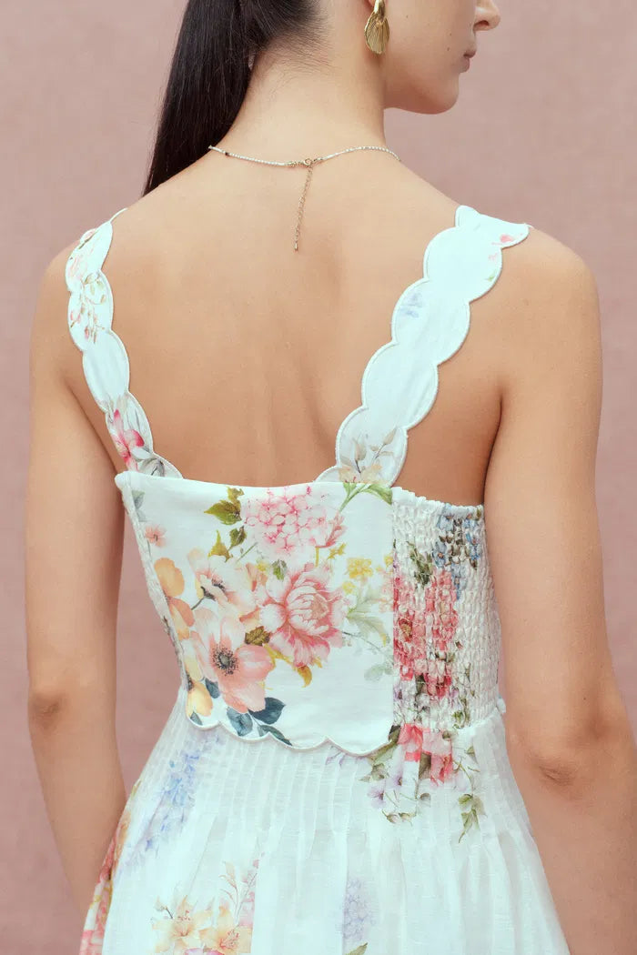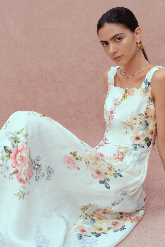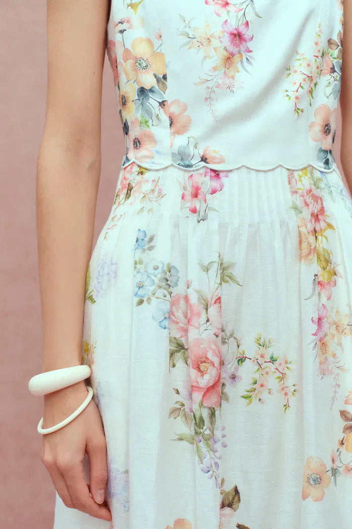 Xena Watercolor Flora Embroidery Strap Dress in Silk-Linen