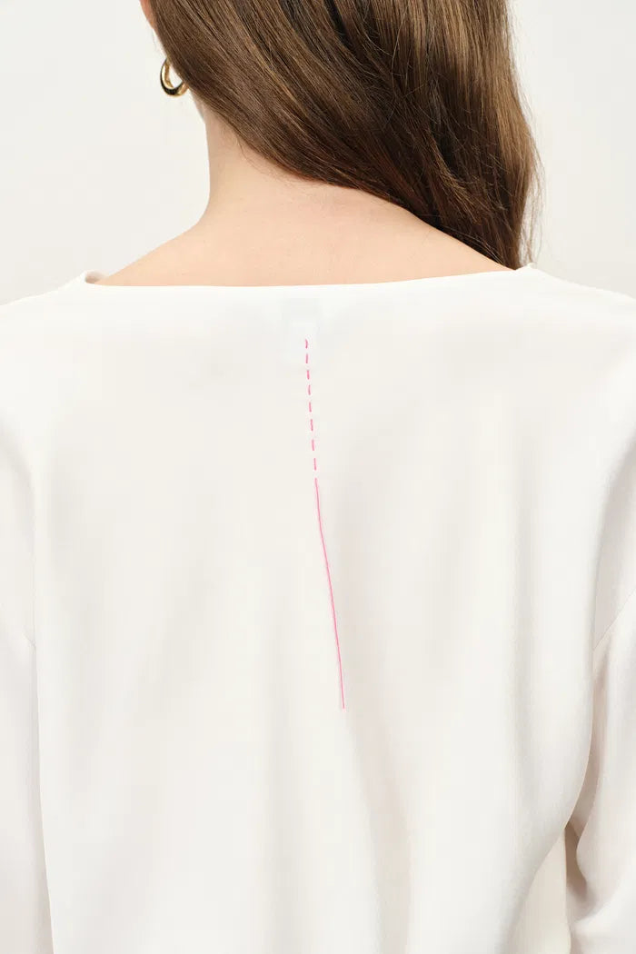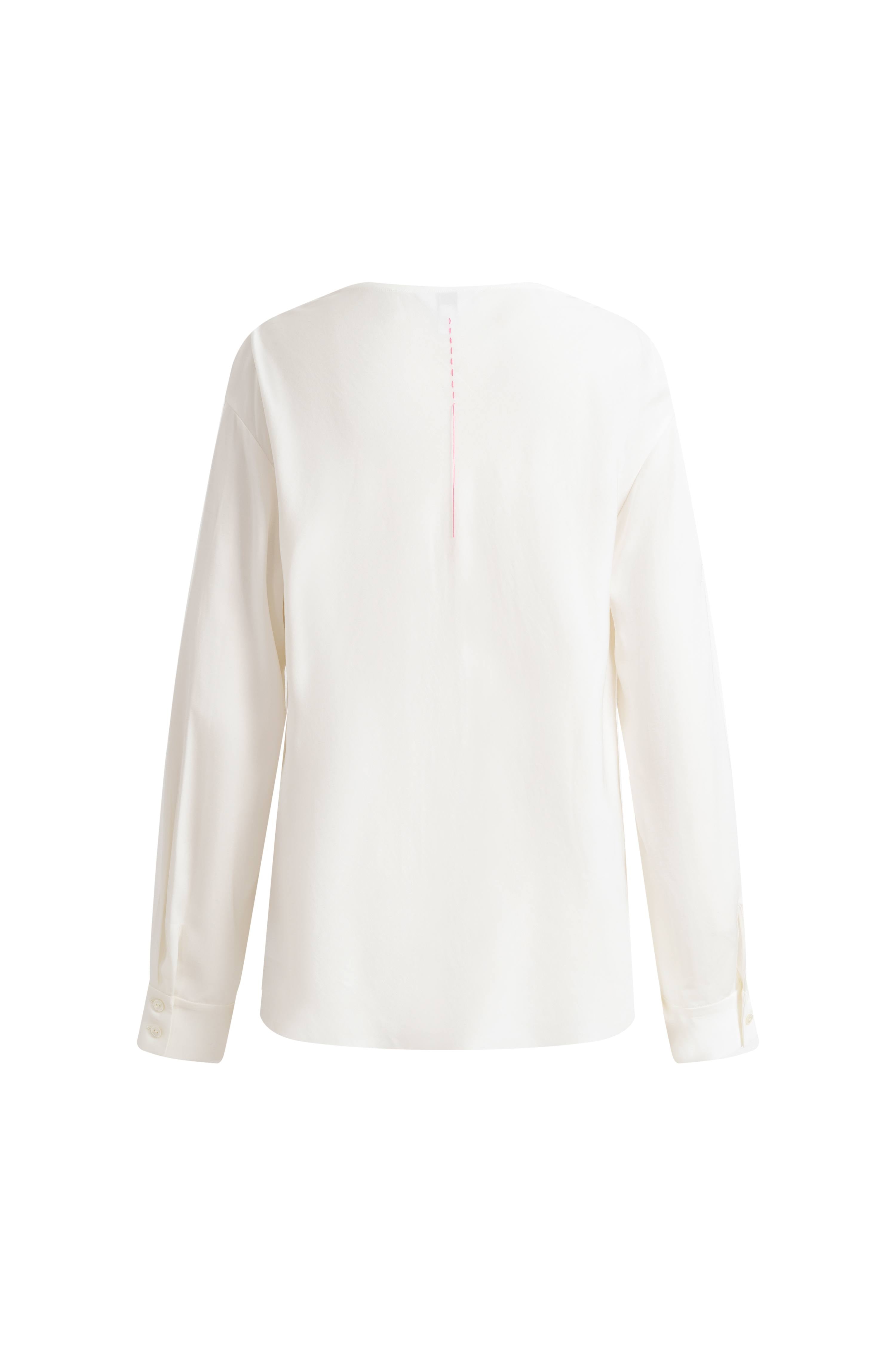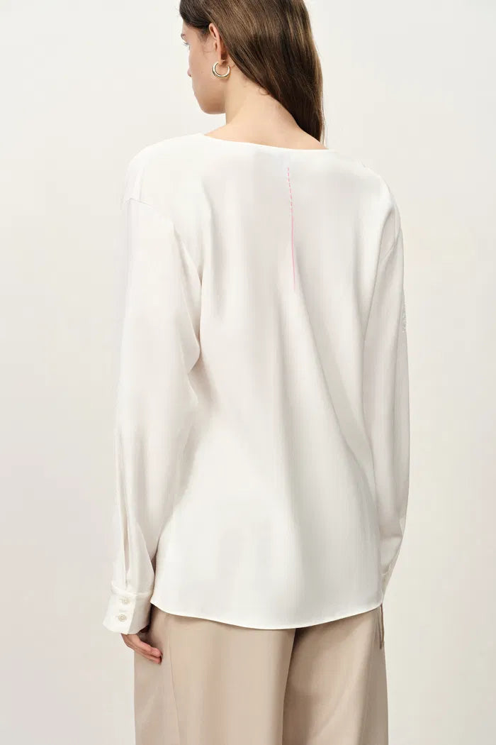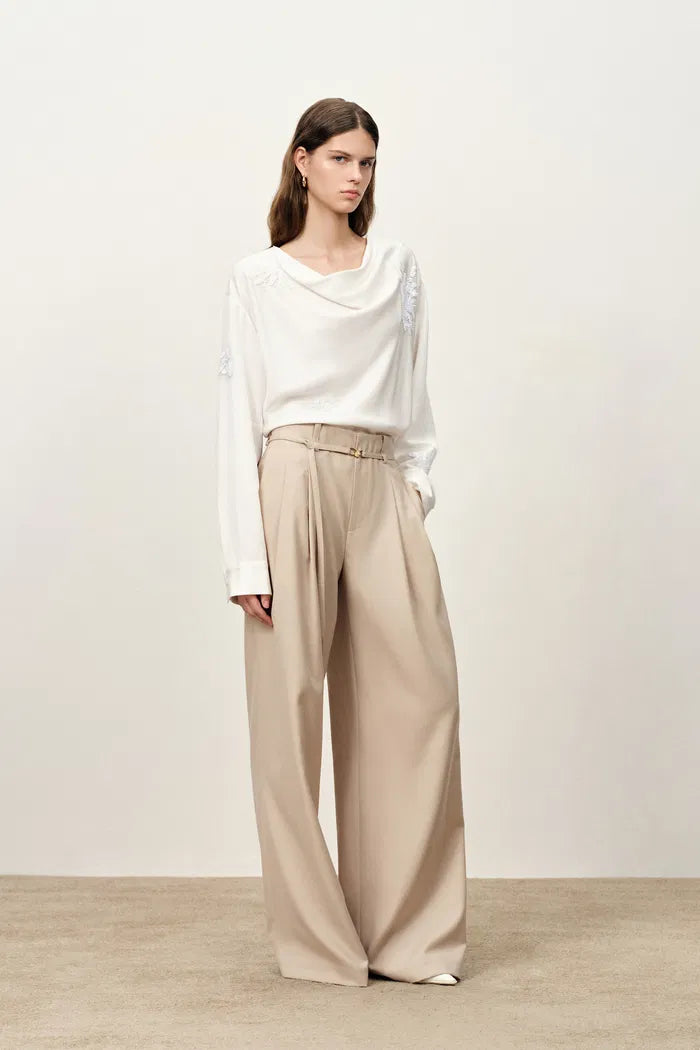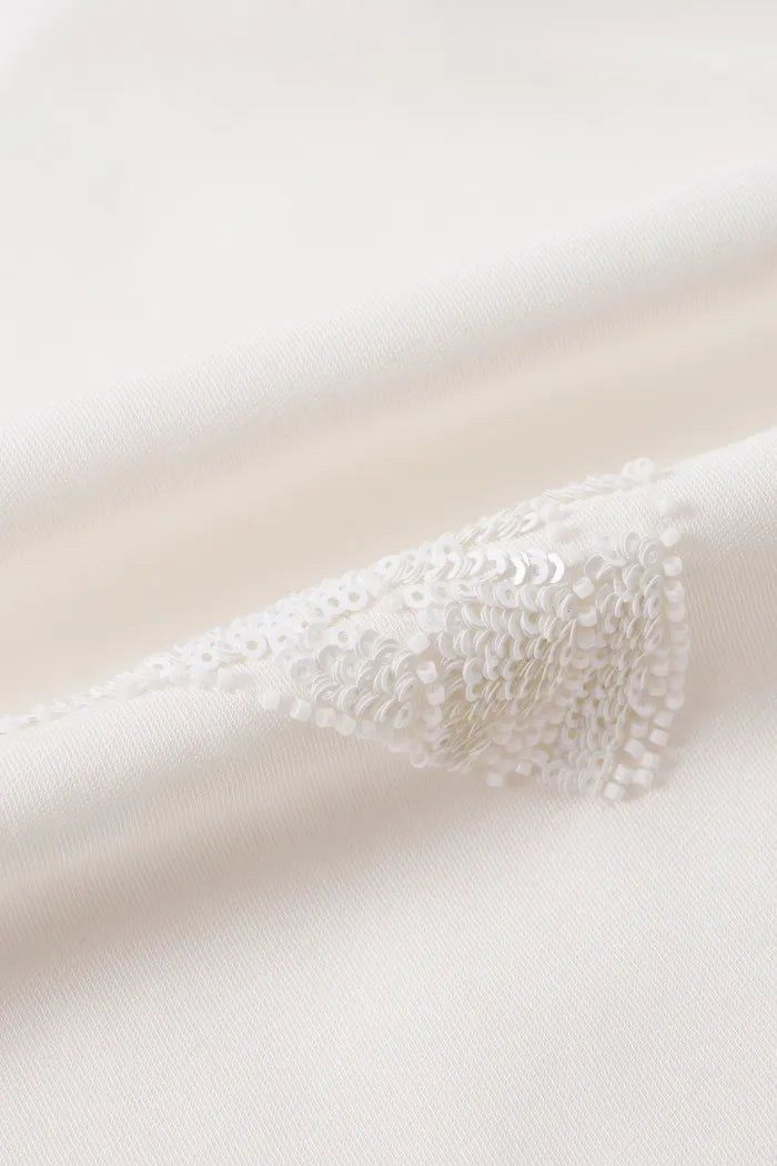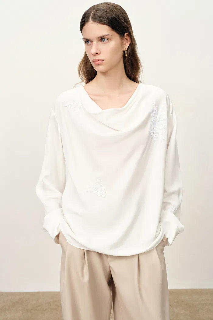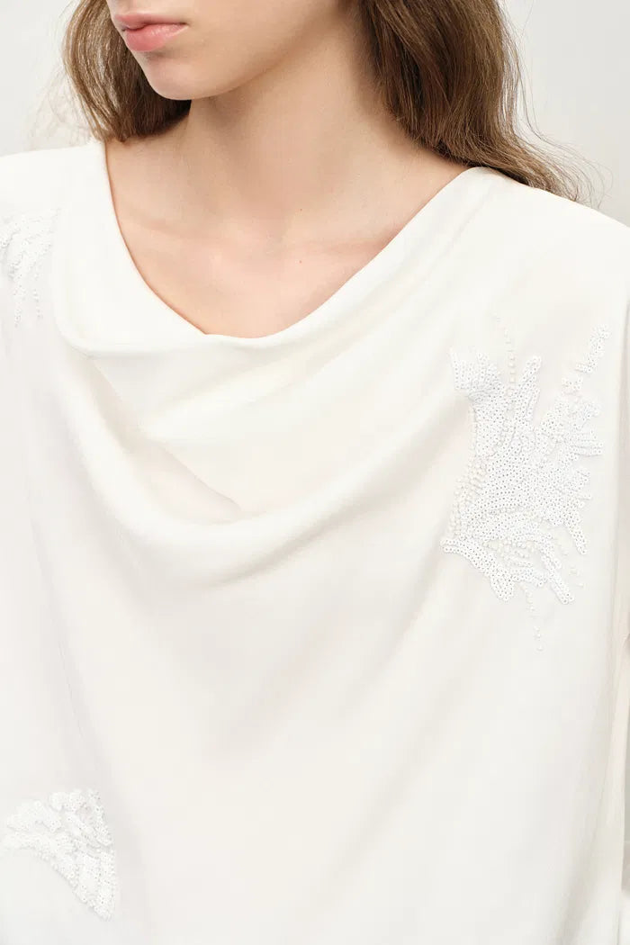 Pearl-white satin with a draped neckline that creates movement on its own. Beaded embroidery sits softly over the sheen, and the relaxed fit makes it an easy piece to throw on under darker layers.