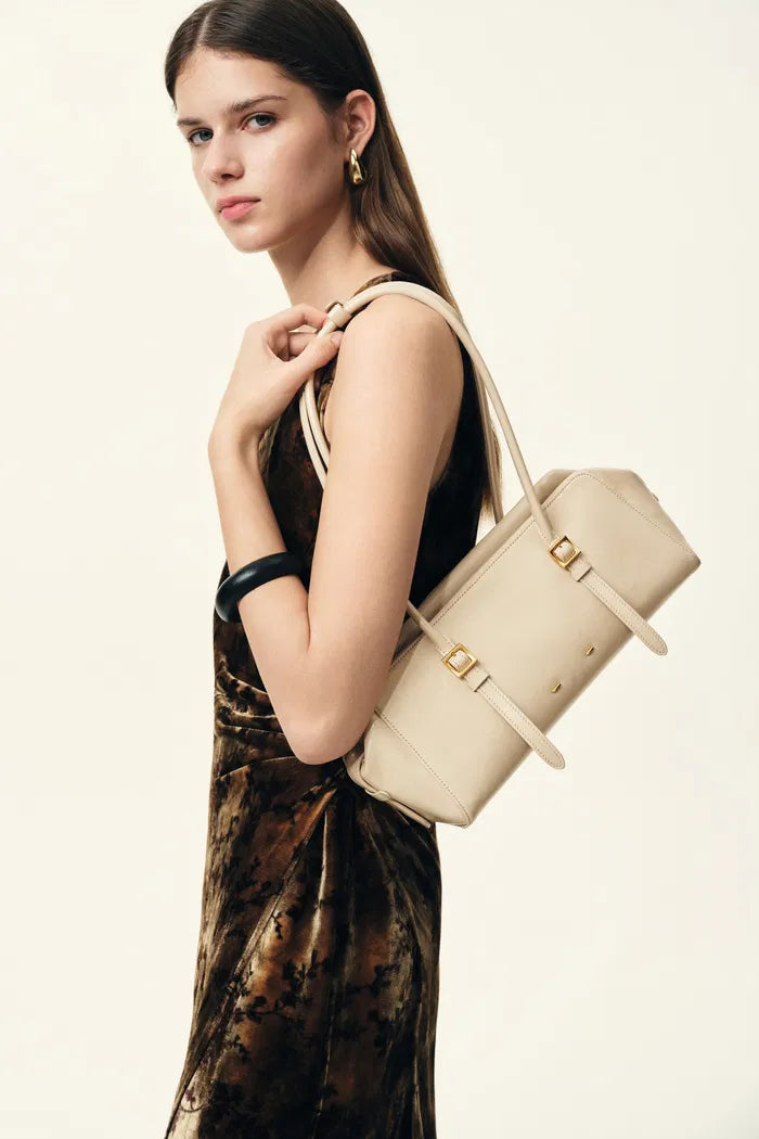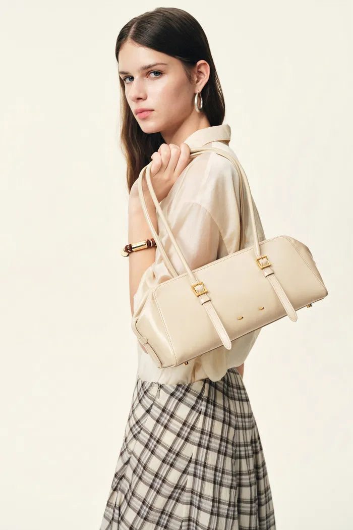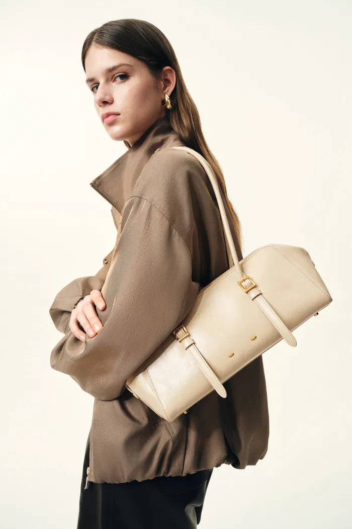 Slim column-inspired handles with two adjustment holes and a buckle to prevent slipping when worn on the shoulder.