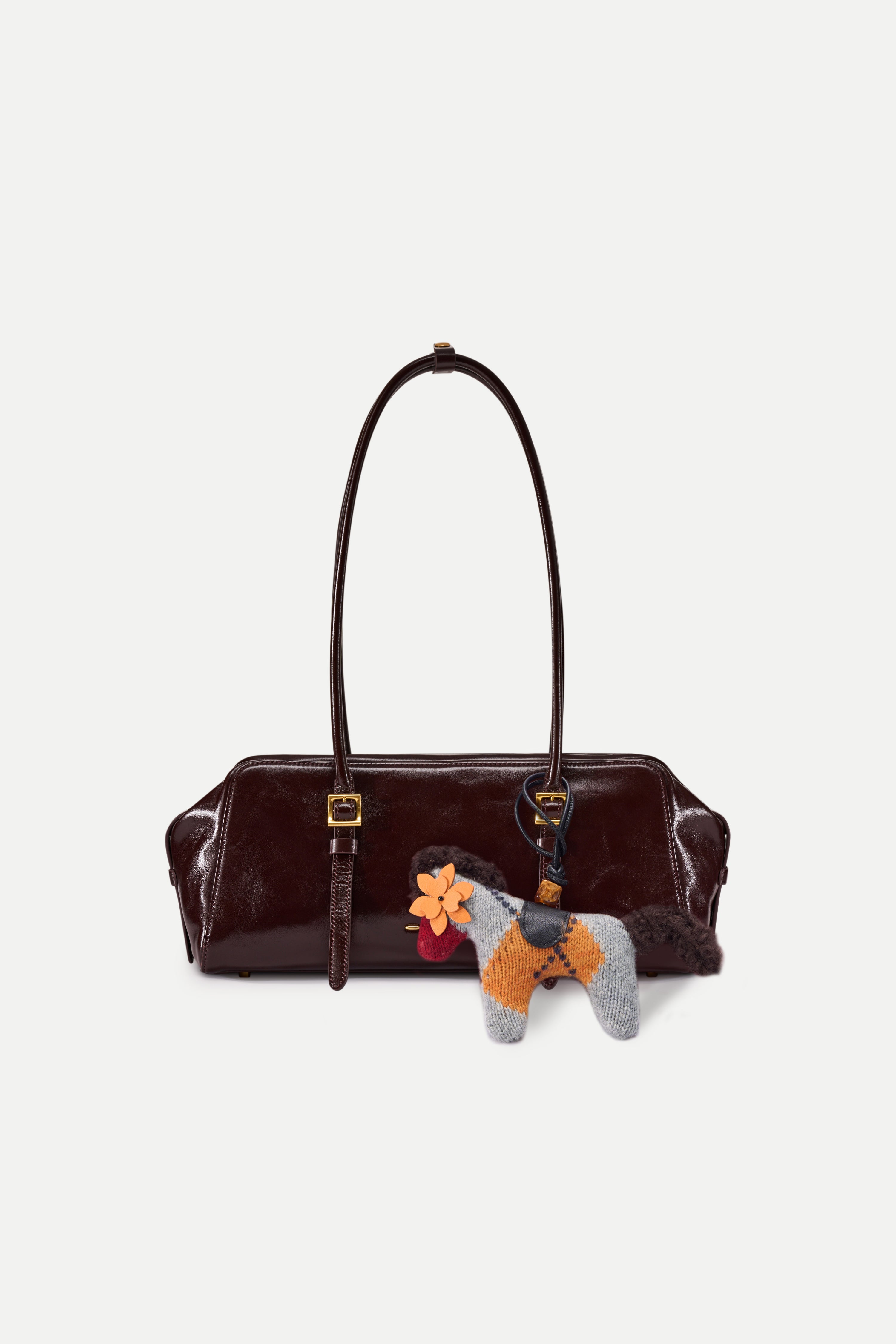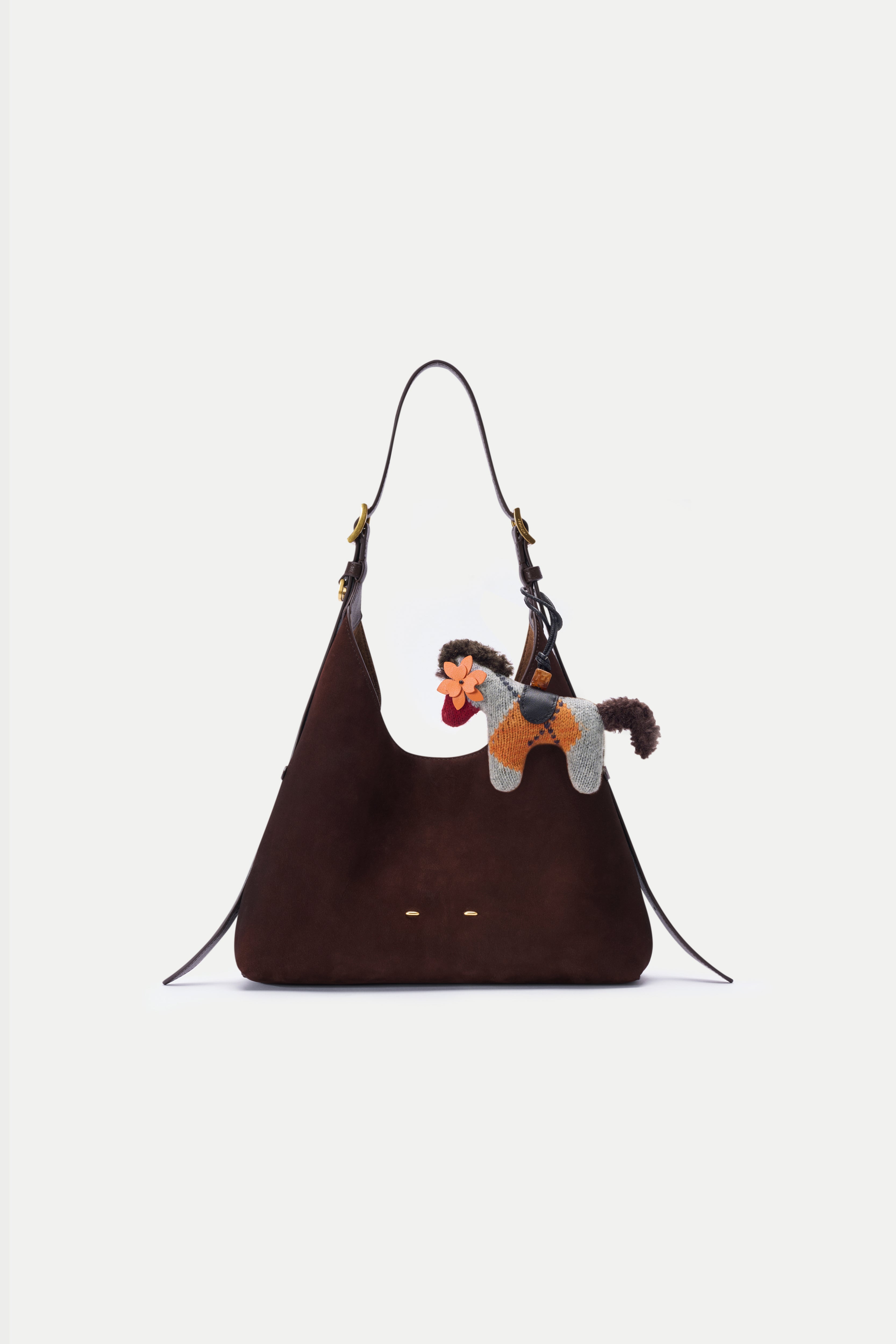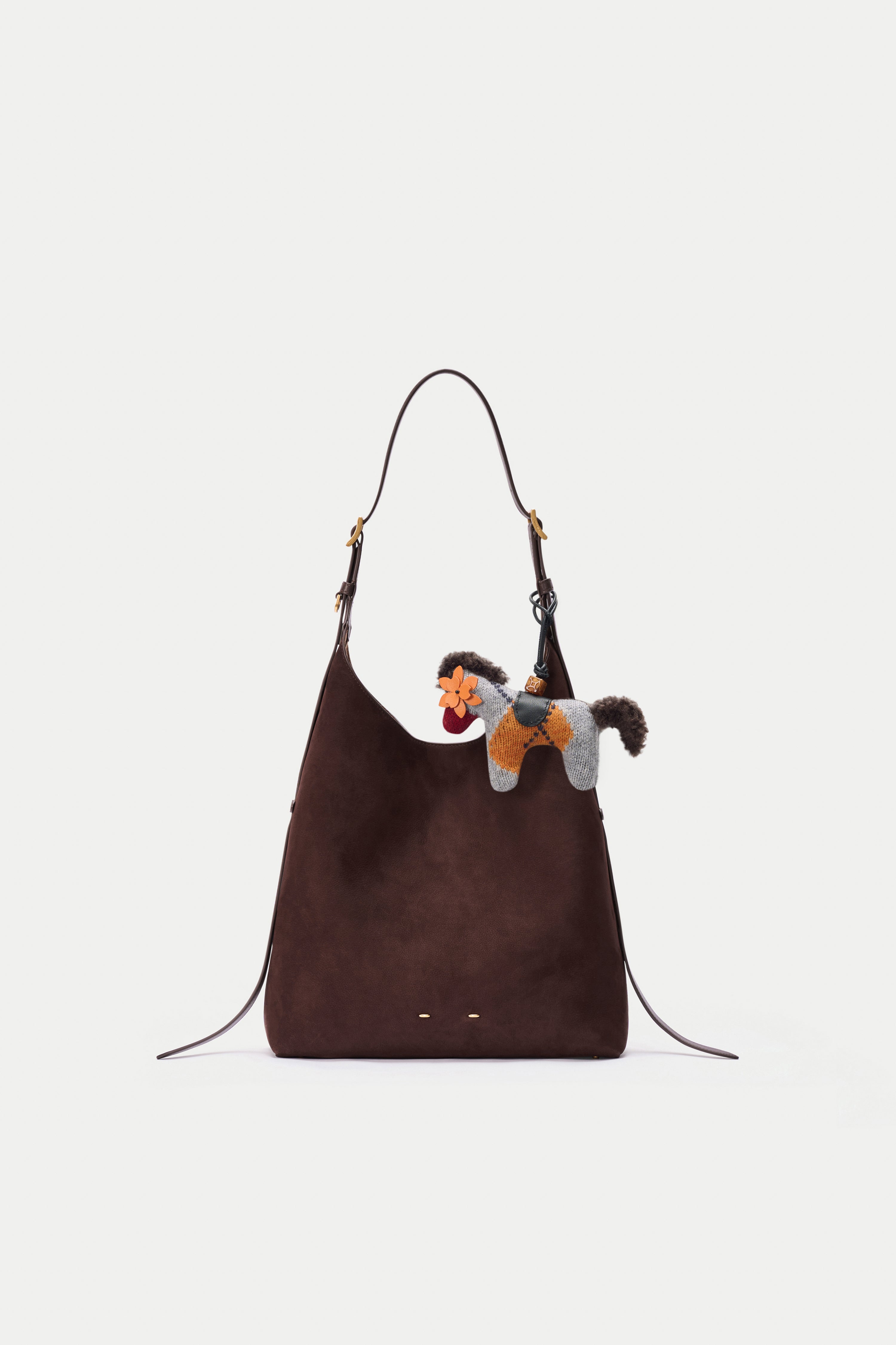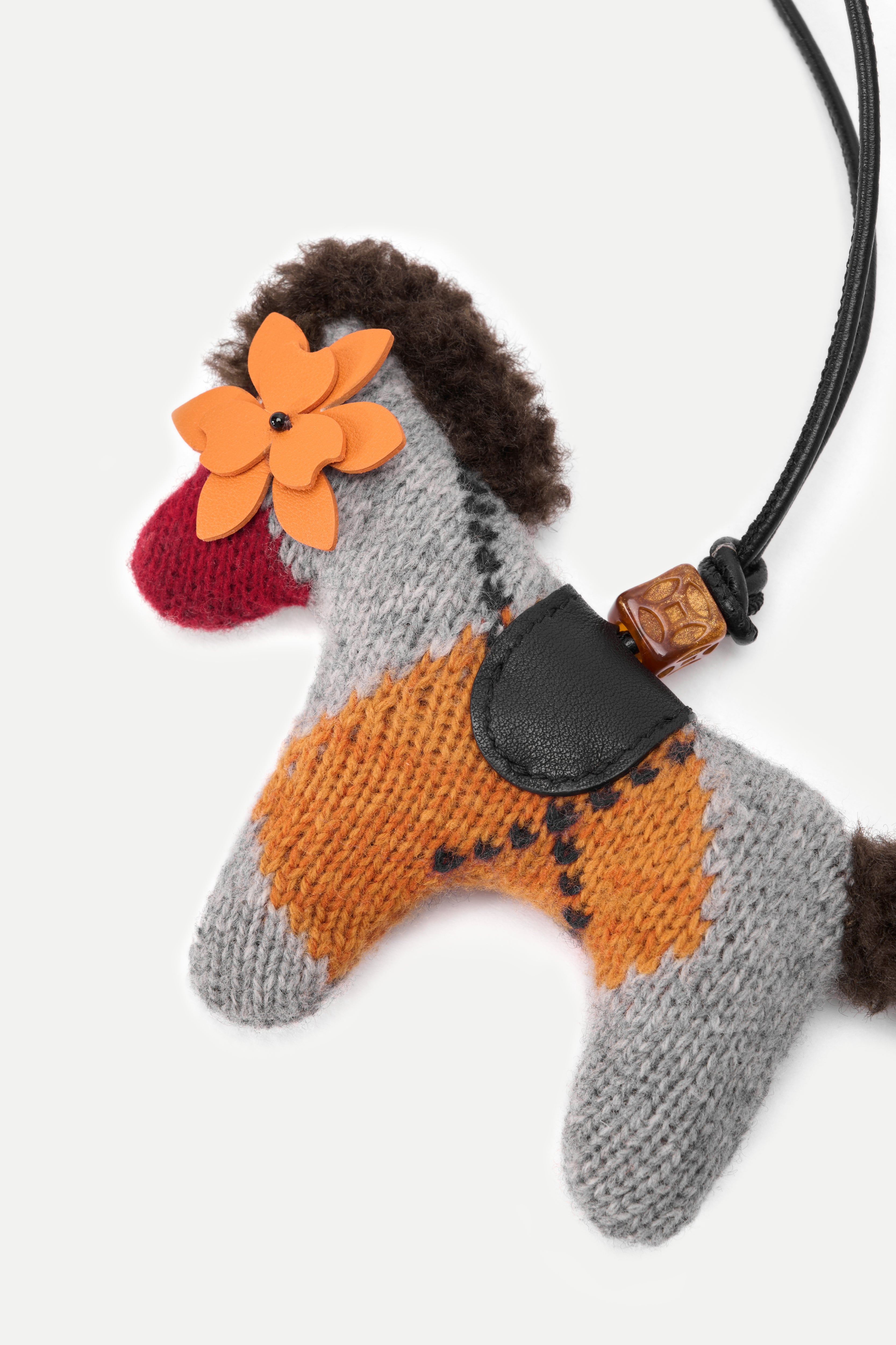 This knitted pony bag charm brings a playful British check twist into a soft, winter-ready accessory. The light heather grey base is lifted with a bold golden-orange contrast, while the fuzzy mane and tail add texture you can actually feel. Finished with a leather flower on the front and a cleaner, minimalist back.